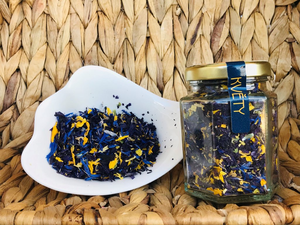 Směs jedlých květů složená z okvětních plátků slézu maurského, chrpy polní a slunečnice, které jsou s láskou nasbírané a usušené. Barevná modrofialová kombinace zjemněná žlutými lískty slunečnice dodá každému pokrmu moderní a exotický vzhled. Vhodné k ozdobení salátů, sladkých desertů či pomazánek. Inspirujte se novým trendem v gastronomii, a dozdobte své pokrmy krásnými jedlými květy.
